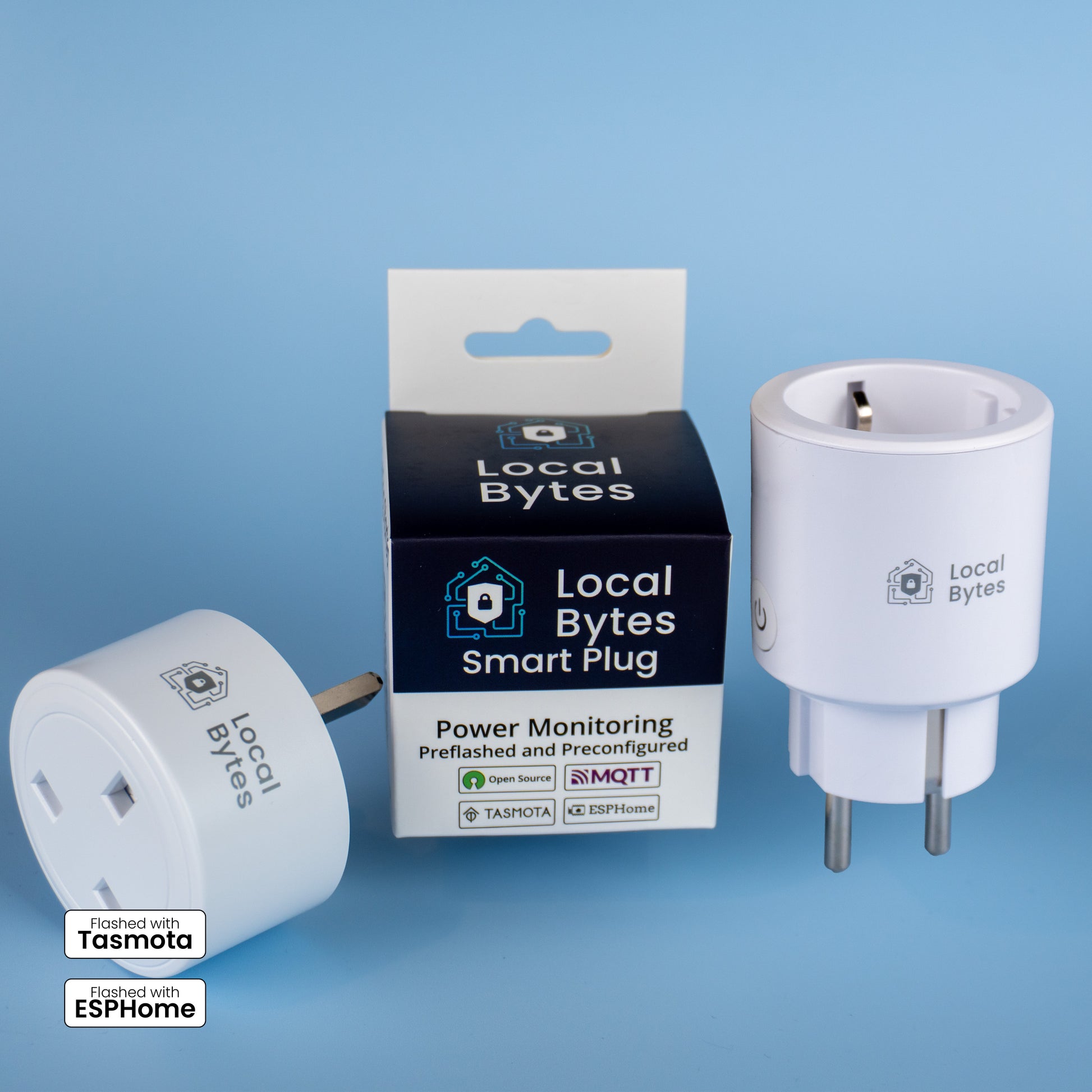 The Local Bytes Power Monitoring WiFi Smart Plug, preflashed with Tasmota/ESPHome.